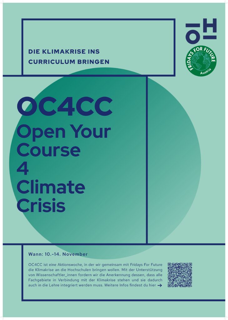 Im Rahmen von OC4CC können wir als Studierende uns engagieren und die Klimakrise in unsere Studien bringen. Dafür müssen wir alle unsere Lehrveranstaltungsleiter_innen dazu aufrufen um bei OC4CC mitzumachen!